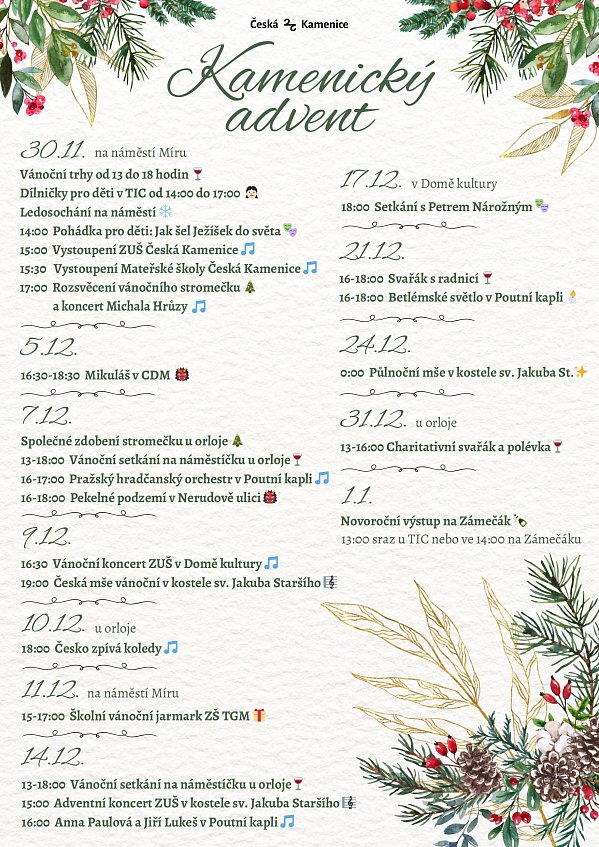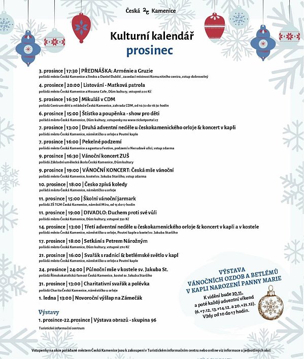 Prosinec je za dveřmi a s ním i nezaměnitelná atmosféra Vánoc. Do ní vpluje i naše město, které nabídne celou řadu vánočních kulturních akcí. Už tuto neděli nás čeká slavnostní rozsvícení vánočního stromu spolu s adventními trhy, Michalem Hrůzou, dílnami a pohádkou pro děti. Vánoční akce nás budou provázet po celý advent; těšit se však můžeme i na slavnostní otevření nové kavárny Hosana Kulturák v Domě kultury spolu s Listováním, další divadla, přednášky, Štístka a Poupěnku, svařáky, koncerty a mnoho dalšího.
